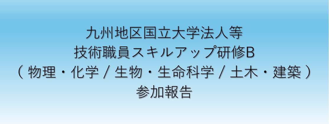 この研修は九州地区の技術職員が、その職務遂行に必要な技術的資質の向上を図ることを目的として行われるもので、”スキルアップ研修B”は「物理・化学」「生物・生命科学」「土木・建築」の3テーマ(希望するもの1つを選択)についての研修です。